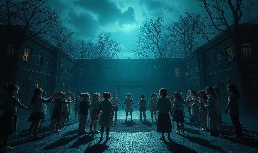 A group of children stood in the center of the playground, a small, unsettling army. Their voices rose and fell in an eerie chant, their words uniform and chilling.